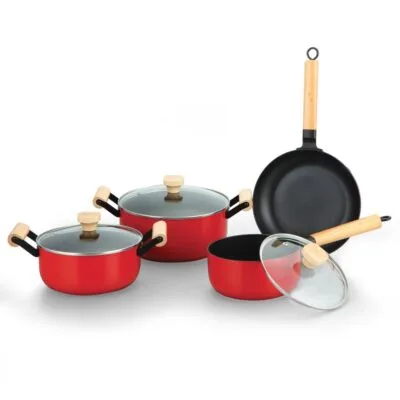 Juego de Ollas Record Ruby Antiadherente de 7 Piezas Con Asas de Madera y Tapa de Vidrio Templado