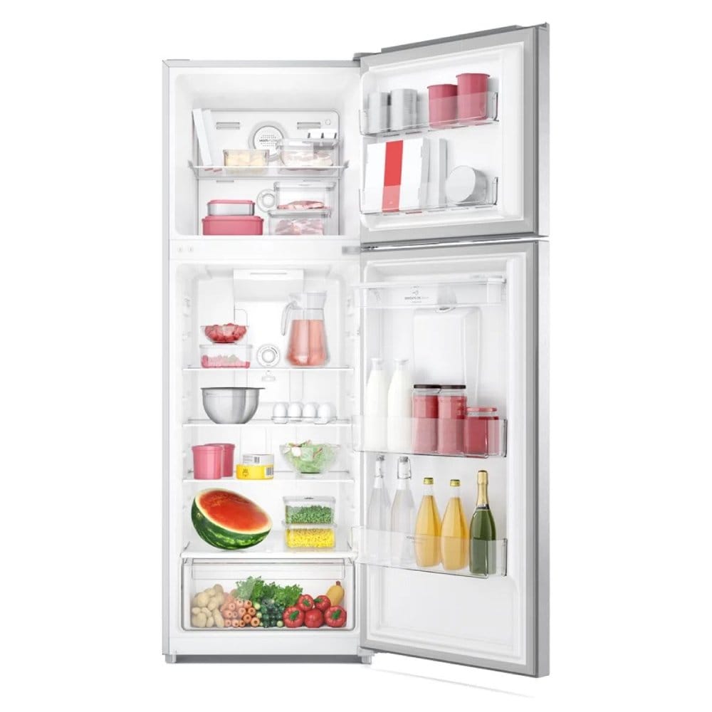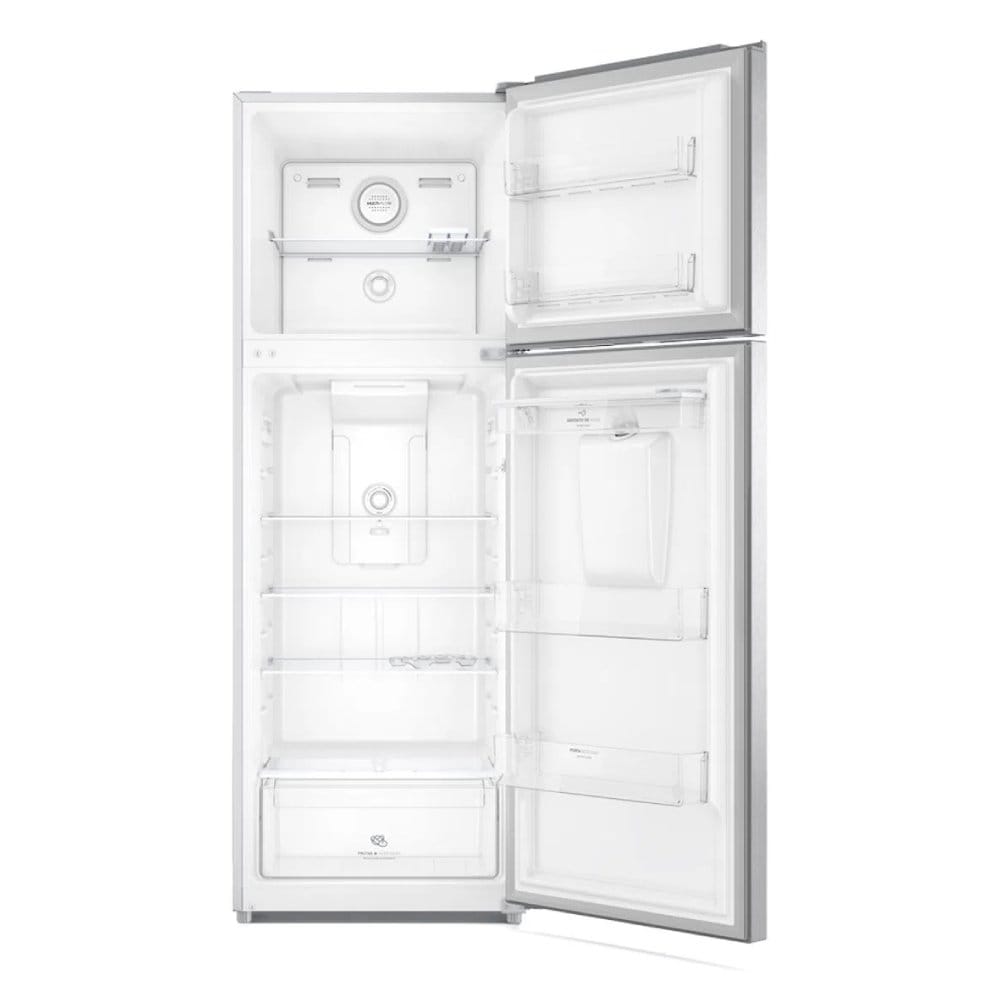 Equipado con un sistema de descongelamiento automático y tecnología No Frost, este modelo garantiza que no tendrás que preocuparte por la acumulación de hielo, manteniendo tus alimentos frescos y en perfectas condiciones. La refrigeradora utiliza el refrigerante R600a, que es más ecológico y eficiente en comparación con otros refrigerantes.