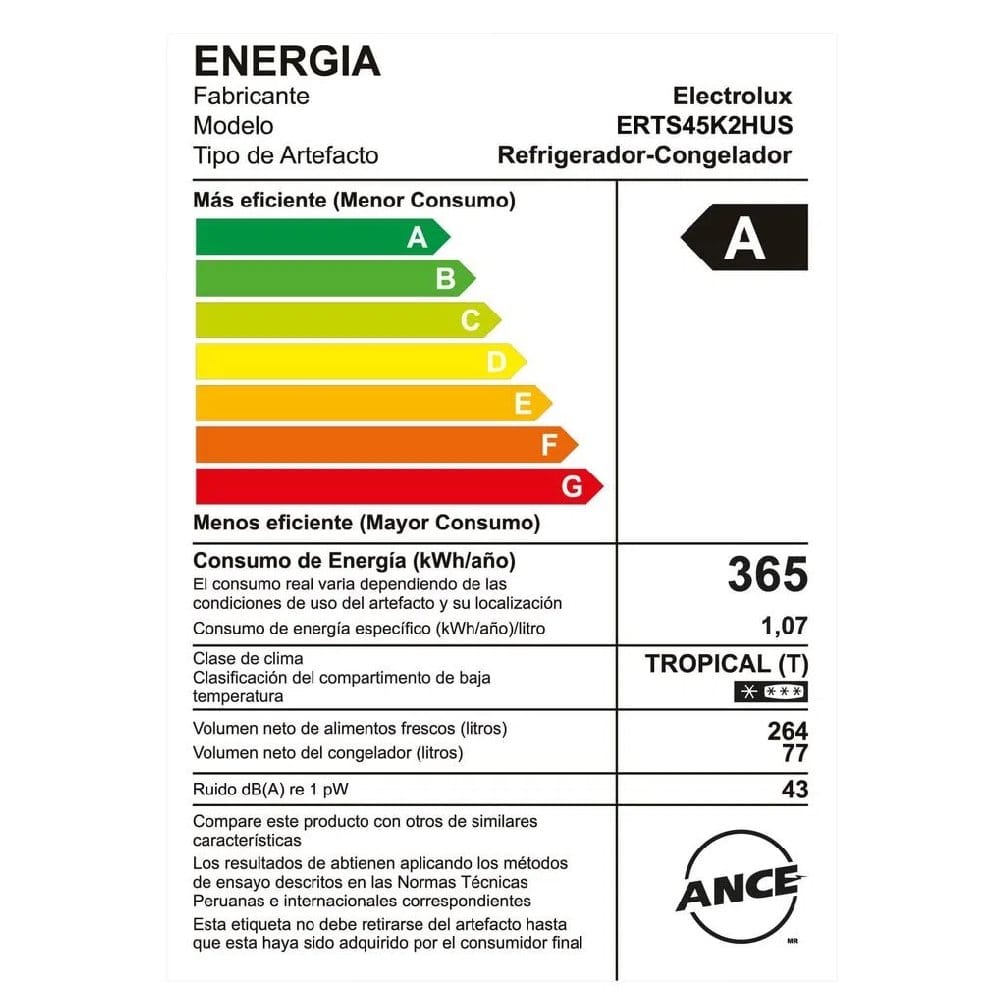 La Refrigeradora Electrolux ERTS45K2HUS es la solución perfecta para quienes buscan un electrodoméstico eficiente y elegante. Con una capacidad total de 341 litros, esta refrigeradora cuenta con un espacioso compartimento de refrigeración de 264 litros y un freezer de 77 litros, ideal para almacenar todos tus alimentos y bebidas de manera organizada. Su diseño de dos puertas no solo es práctico, sino que también aporta un toque de modernidad a tu cocina.