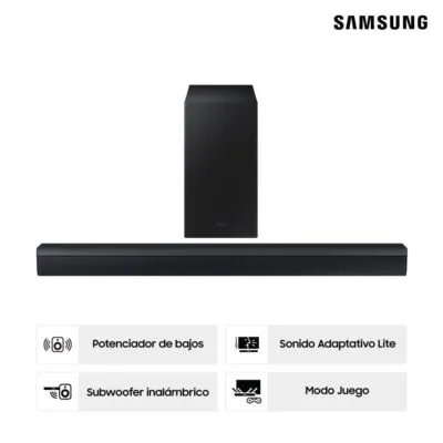 Barra de Sonido Samsung HW-C450 2.1 Canales con DTS Virtual X, Subwoofer Inalámbrico, Potenciador de Bajos, Modo Juego y Sonido Adaptativo Lite